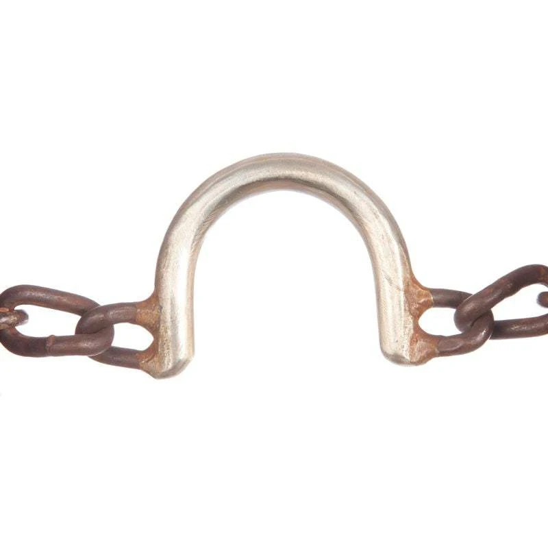 With the help of Tommy Blessing, we have taken the best selling NRS stainless chain bit designed and built by Tommy and developed a silver line with the same 3 original mouthpieces on 3 new cheeks. All have an antique brown finish with engraved silver trim. S-style cheek. Engraved silver bars along the cheek with a silver concho at the mouthpiece. This bit has a longer purchase than the typical s-shank giving a different balance point. The feel and control for the rider that is achieved, along with the comfort for the horse, all combine to make a very effective bit. All cheeks are available in the plain chain, medium ported chain and high wide ported chain mouths. Each bit includes curb chain and a rubber washer on each side of the mouth piece to help prevent pinching. Imported.