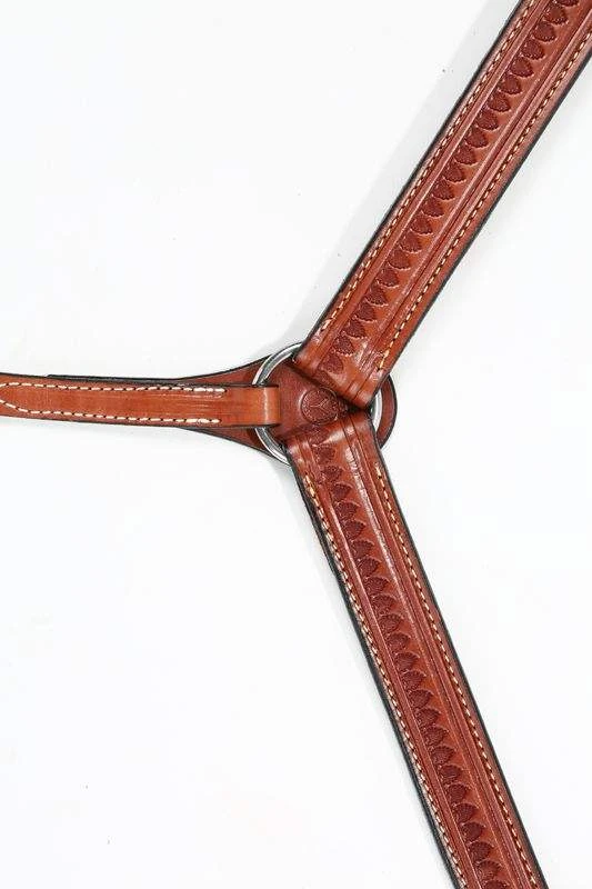This is a beautifully hand tooled breast collar by Circle Y. The shell tooling gives it just enough style but keeps it low key! It is a basic, straight breast collarย that is 1 1/2″ wide and has stainless steel hardware.