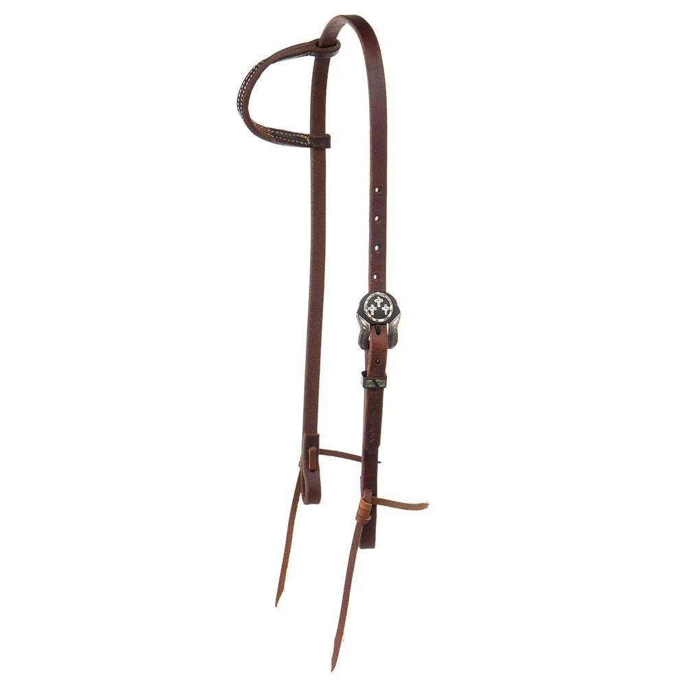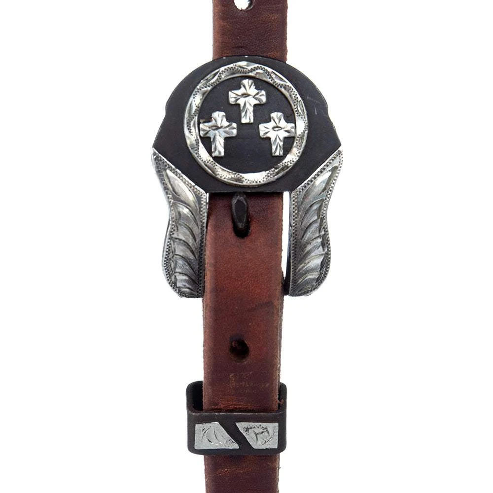 Get it while supplies last at this special pricing! 5/8″ oiled single ear headstall features an antique Three Cross buckle.