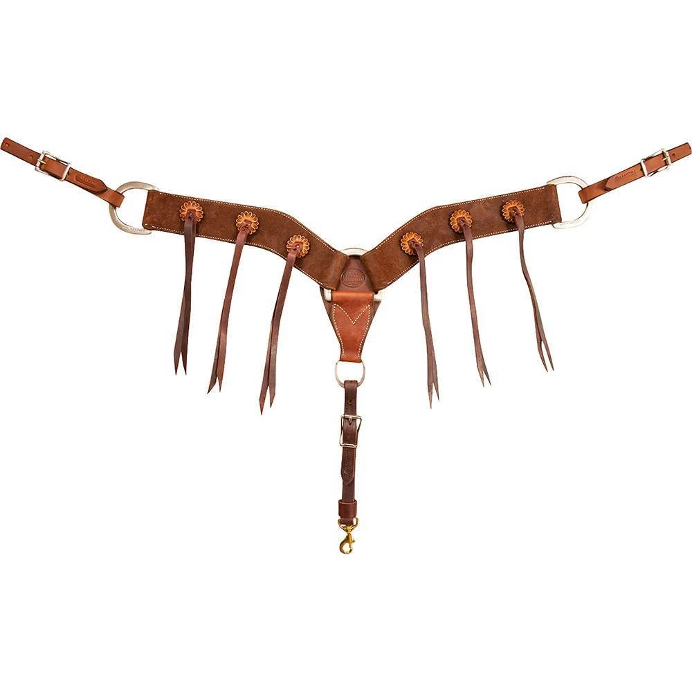 2Â 3/4″ Roughout Chocolate Leather Breast Collar finished with rossettes and strings. This Martin Saddlery breast collar is the perfect size for team roping and more!