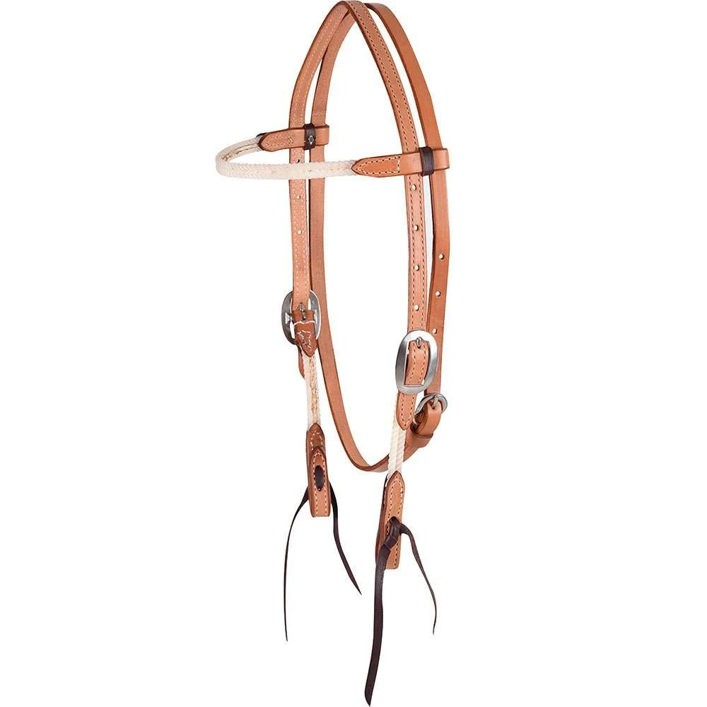 Martin Saddlery natural color leather browband headstall with rope brow &Â cheek, double cart buckles &Â bit ties.