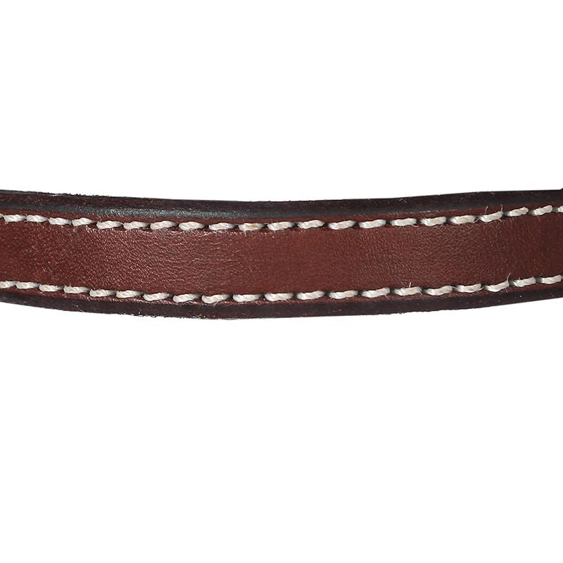 This is a simple, yet attractive, browband headstall. It is chestnut leather that has been moderately to heavily oiled. It has braided rawhide keepers on the cheeks and quick change bit ends.
