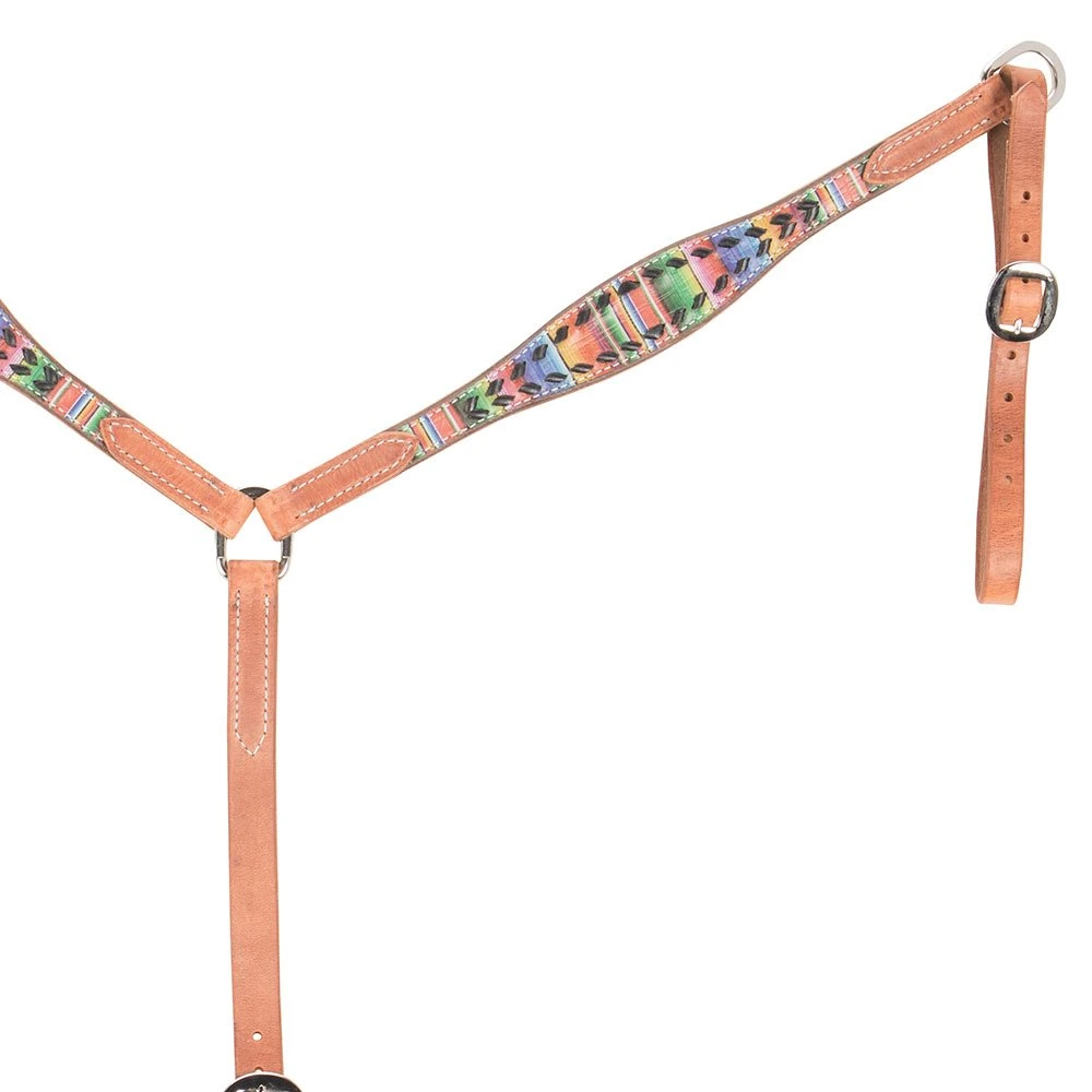A unique serape tapered breast collar that is made for NRS by San Saba Equine. This is a thinner breast collar made from harness leather and overlayed with serape leather and added black buckstitching for detail.