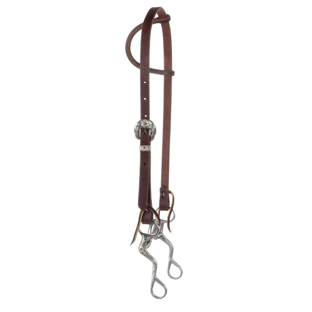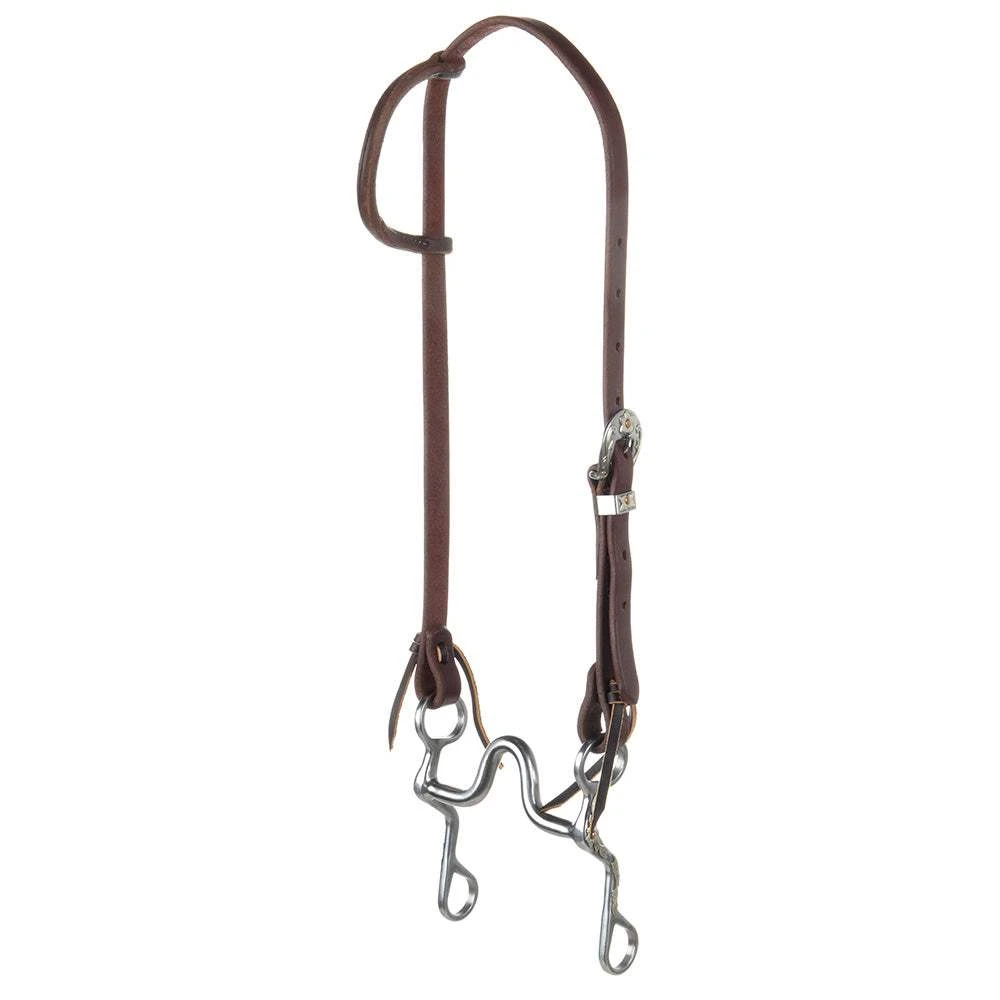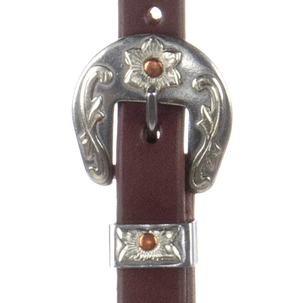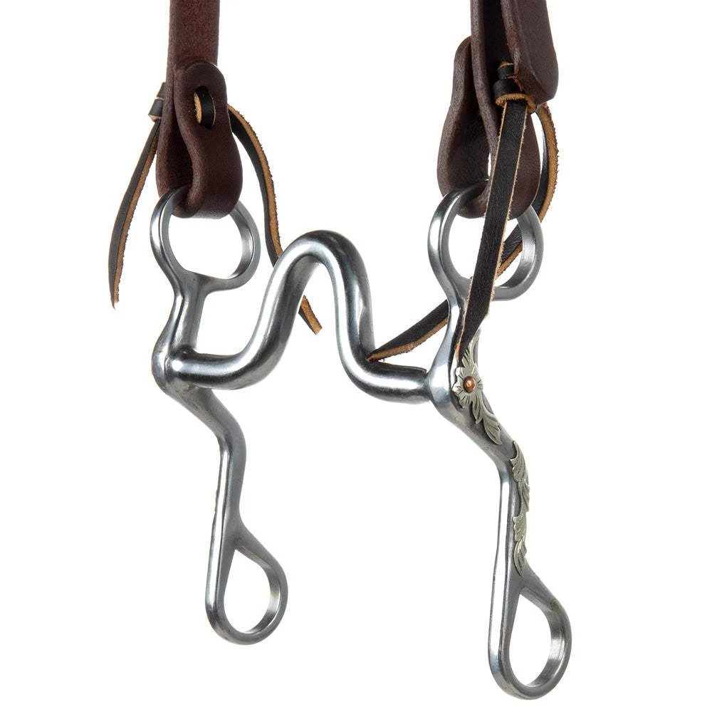 ย Single ear headstall with solid port bit. Accented with floral buckle.
