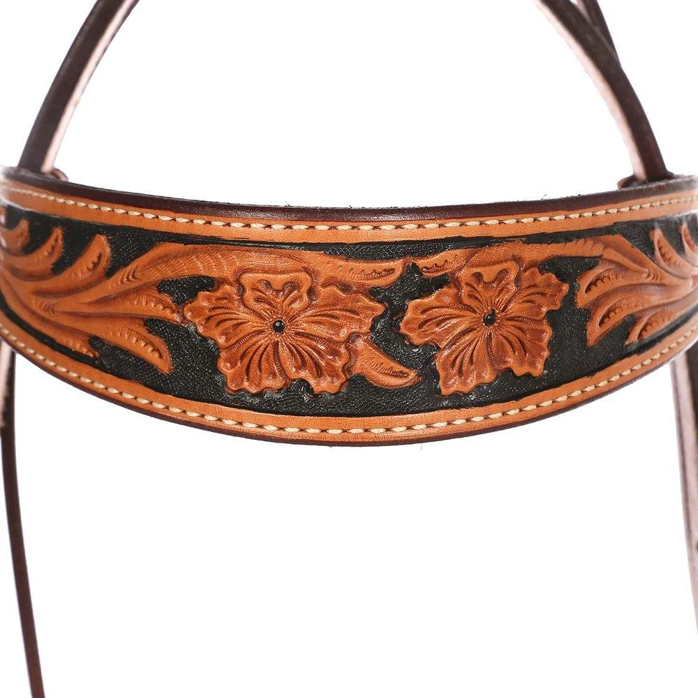 This is a browband, medium oiled headstall with intricate hand tooliing and a black hand painted background.
