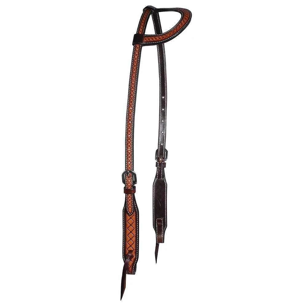 Eye-catching crosshatch tooling pattern set off with a dark border. Cheeks are turned out for a smooth fit against the horse. Stainless steel hardware, lace ties.