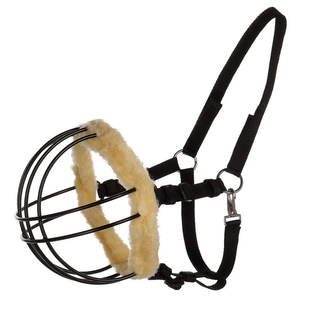 Designed so the horse can eat or drink normally but cannot tear blankets, bite people, crib or chew wood. Made of heavy 1/4″ steel bars with nylon halter.