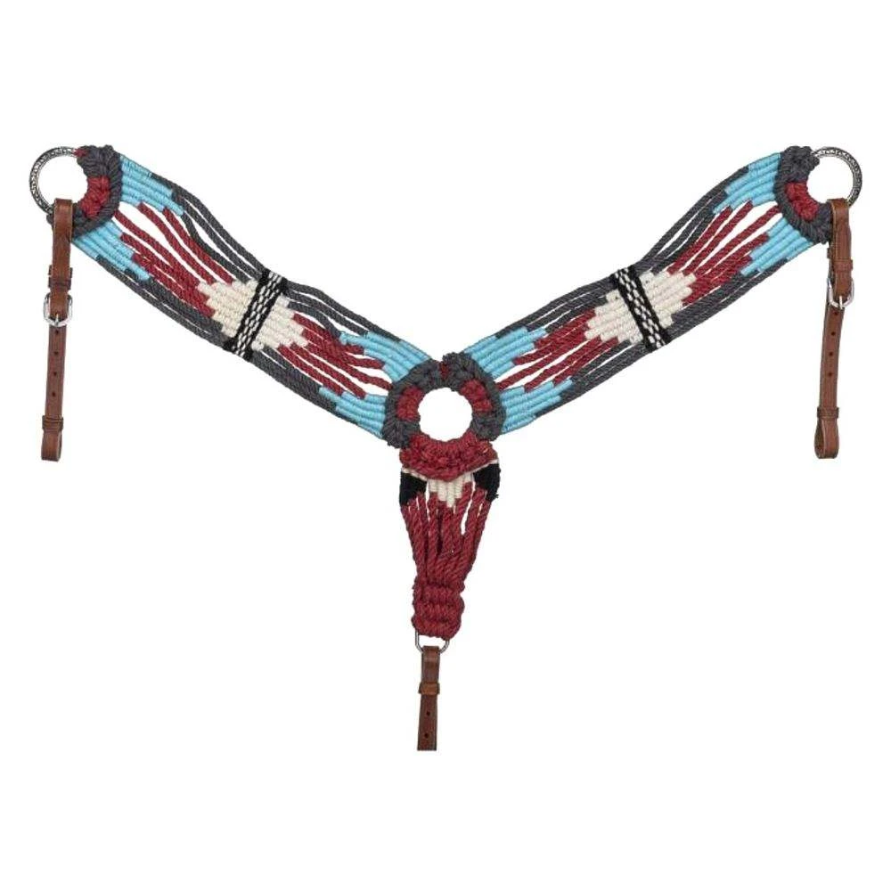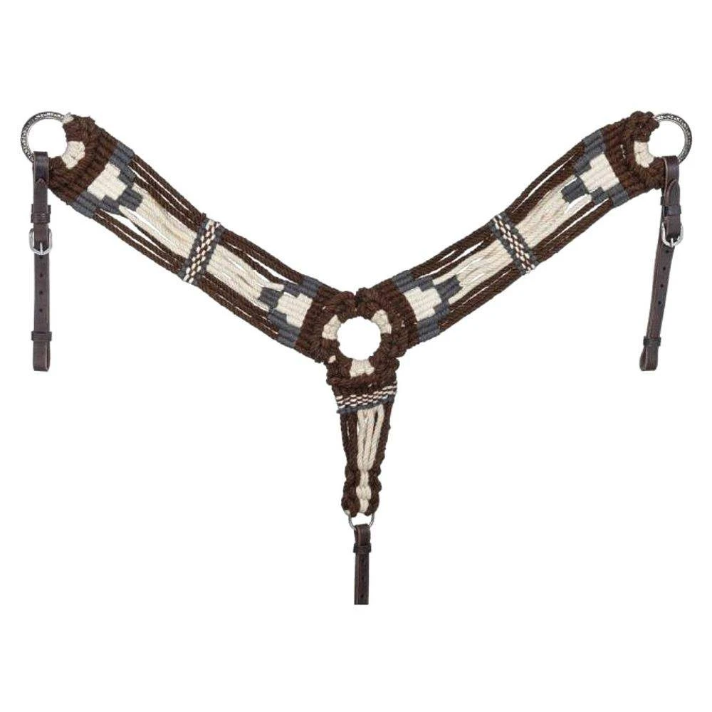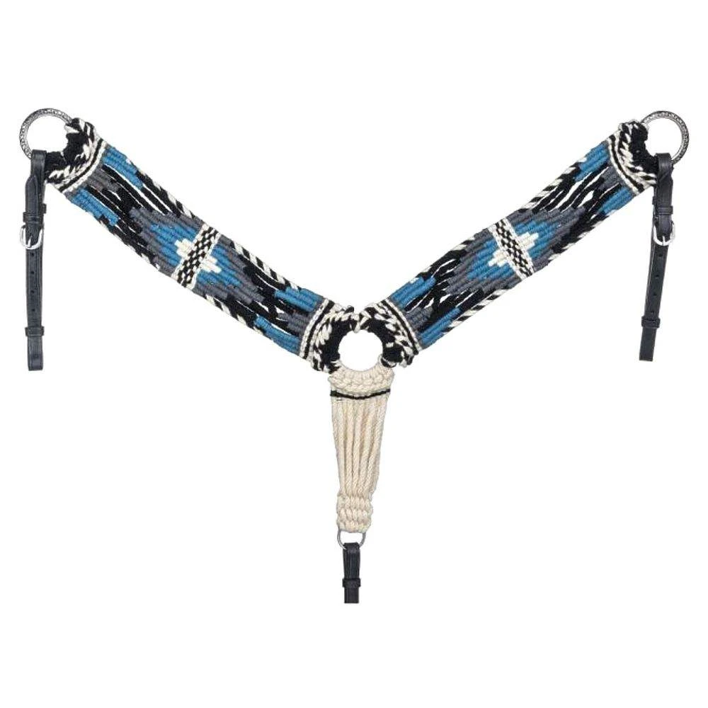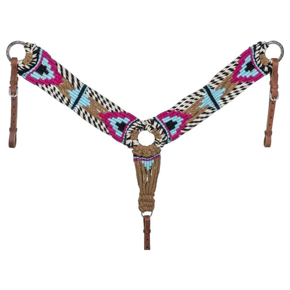 Achieve the appearance of mohair without breaking the bank! This wool string breastcollar is an ideal choice for ranch horse enthusiasts. It features a hand-twisted construction with bold and distinctive color combinations and patterns. Adjustable leather tug straps and a girth snap make it easy to put on and take off.