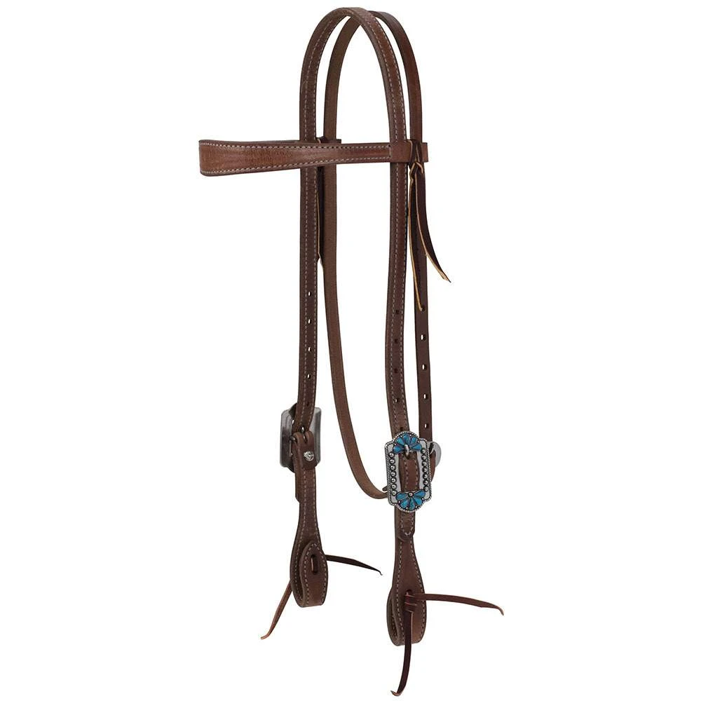 Β Β This Weaver Leather headstall is handcrafted from Hermann Oak premium russet harness leather that’s dipped in oil, dressed with saddle butter and hand rubbed for an exceptional feel. Exclusive designer hardware features antique nickel zinc die cast buckles accented with floral turquoise stone design.